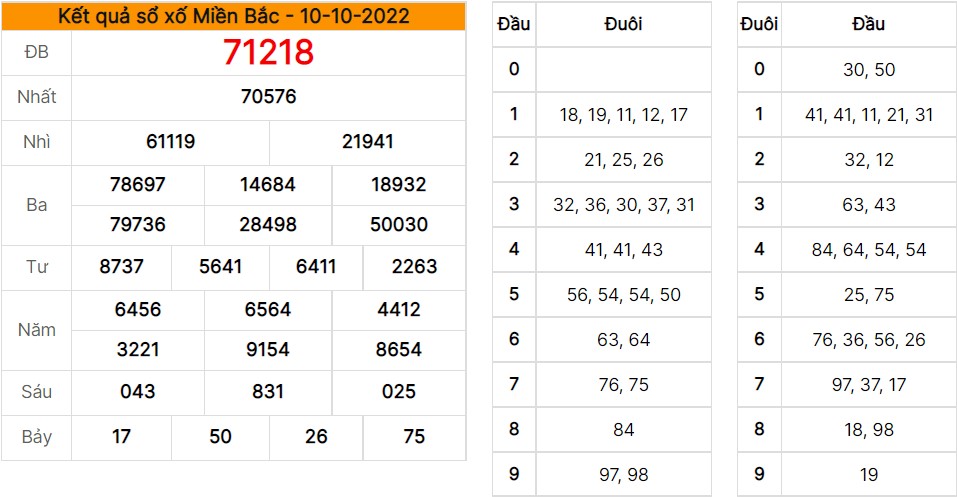Kết quả xổ số miền Bắc 10/10/2022